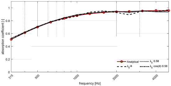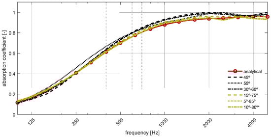 An additional condition of Paris’ formula is the integration limits, which are also defined by nature from 0 to 90°. Figure 11 shows the differences when choosing several integration limits summarized in Table 3, with a 5° step and, as suggested in Reference [35], the case in which only the calculation at 55° is carried out for locally reactive materials is also compared. The figure shows good agreement with analytical data, so Paris’ integration can be performed with a 10° to 80° range, with 10° steps, without losing information.
