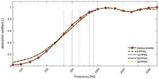 Measured normal incidence sound absorption compared to 1D FDTD simulations using different PPWL values for a 60 mm melamine sheet.