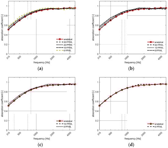 The 60 mm melamine sheet sound absorption calculated with JCAL model and compared to 2D FDTD simulations using downscaled PPWL factors from Table 4. The 1D NEAM coefficient values are calculated at (a) 30 PPWL, (b) 20 PPWL, (c) 10 PPWL, (d) 6 PPWL.
