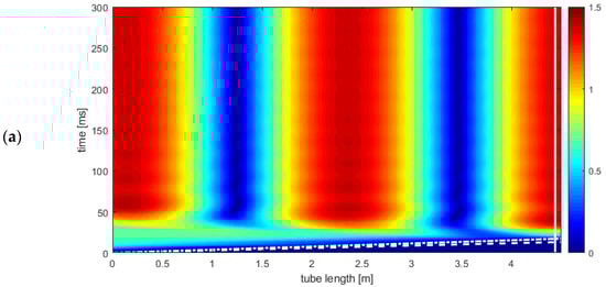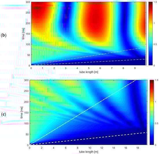 Space–time plots for a 60 mm melamine sheet at 100 Hz and different incidence angles. Absolute pressure values are represented with [0–300] ms time interval and different incidence angles, (a) 40°, (b) 70°, (c) 80°. White continuous line represents the first NEAM layer, dashed line , and dotted-dash . Note that the tube length increases with the incidence angle.