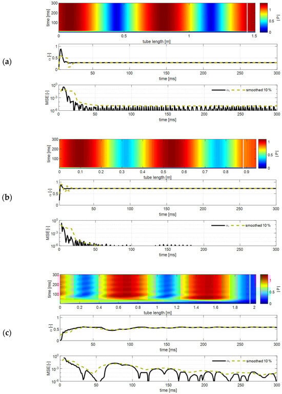 Each figure, computed for a 60 mm melamine sheet, is divided in three rows: (1) Absolute space–time pressure. (2) Diffuse absorption coefficient calculated using different true values. (3) Mean Squared Error (MSE) with the black line representing the error using the last time pressure to calculate the true value of the absorption coefficient, and dotted green line a 10% sample smooth with an average of the last 150 ms as the true value. The different cases shown correspond to (a) 250 Hz at 20°, (b) 500 Hz at 40°, (c) 1 kHz at 80°.
