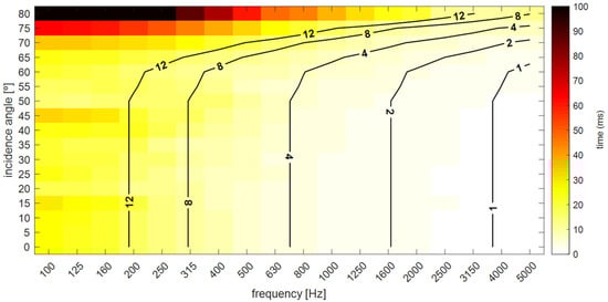 Minimum propagation time needed to compute the diffuse field sound absorption coefficient of a 60 mm melamine sheet, for each angle and frequency, with an error of 10−3. True value of alpha was calculated with an average of the last 150 ms calculation. Black lines delineate time limits in milliseconds.