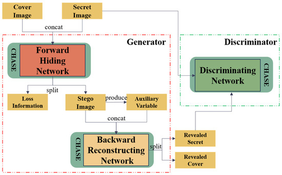 The process in which the cover image and secret image undergo the forward hiding network, resulting in the generated stego image and associated loss information. Subsequently, the stego image, along with auxiliary variables produced from stego image, is input into the backward reconstructing network. This network reveals the cover image and secret image. The revealed secret image, alongside the original secret image, undergoes assessment by the discriminator for differentiation. Through iterative adversarial training, the quality of the reconstructed secret image is refined.