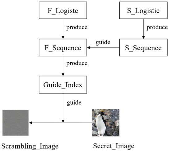 The Logistic chaotic mapping is expressed in Equation (3), where the control parameter μ ranges between (0, 4], but when the value range is within the interval of (3.5699456, 4], it enters the chaotic state [36]. We utilized the logistic chaotic map twice with different parameters to generate random sequences. As we can see in Figure 4, initially, using the Logistic chaotic mapping (F_Logistic) to generate a chaotic sequence (F_Sequence) of the same size as the sub-image for reordering, the position index of each element in this ordered sequence is calculated based on the original chaotic sequence. Subsequently, we used Logistic chaotic mapping (S_Logistic) again with distinct control parameters and initial values to generate four copies of the sequence (S_Sequence) for reordering, each having a quarter of the length of F_Sequence. Calculations are performed to obtain the position index of each element in the ordered sequence, guiding the reordering of F_Sequence sequentially to intensify its disorder. Finally, Guide_Index is acquired and utilized as guidance to determine the pixel positions of the sub-image to be scrambled.