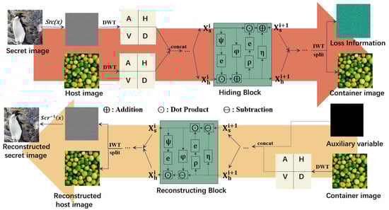 where ρ(·), η(·), φ(·), and ψ(·) can represent arbitrary functions. Here, e(·) signifies a Sigmoid function, and the coefficient α acts as a regularization factor to mitigate numerical instability arising from the e(·) function. Following the last forward hiding block, the outcomes undergo IWT to obtain the stego image and loss information, respectively. For the backward reconstruction module, the information flow direction is inverted. In the i-th module, the output () from the i + 1-th module serves as input (), as expressed by the following equation: