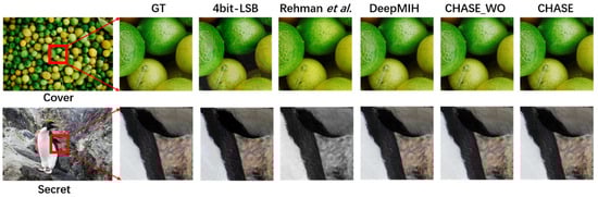 Qualitative results. Figure 6 displays images generated by different steganography methods, including 4bit-LSB, Rehman et al. [22], DeepMIH [34], our CHASE, and CHASE_WO. Visually, 4bit-LSB exhibited noticeable artifacts, Rehman et al. produced a yellowish tint, while CHASE, after image scrambling, closely resembled the corresponding cover image. The secret image obtained from the reduction process was nearly identical to the original secret image, showcasing high-fidelity results even with large capacity and complex hidden information.