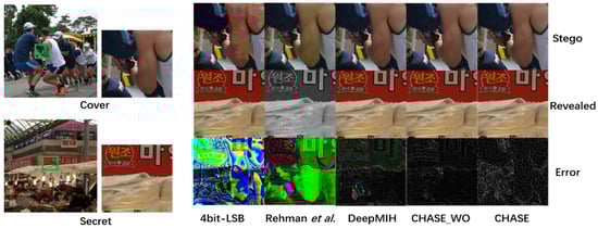 In Figure 7, the error images produced by various methods highlight the effectiveness of the image-permutation. Despite the challenging task of hiding a secret image with complex texture in a cover image, CHASE’s error image exhibited no texture replication artifacts associated with the original secret image. In contrast, error images from 4bit-LSB, Rehman et al. [22], DeepMIH [34], and CHASE_WO showed discernible texture replication artifacts, revealing the outline of the secret information and posing a risk of information leakage. In comparison, CHASE not only achieved a relatively larger hiding capacity but also maintained superior visual effects and security.