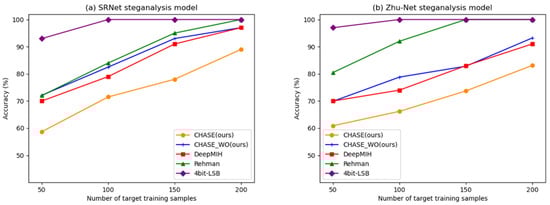 We generated 1500 stego images through both CHASE_WO and CHASE, forming their respective test sets with corresponding clean cover images. During the training of SRNet and Zhu-Net, the batch was set to 1, and other hyperparameters were configured according to their respective papers. Figure 9 illustrates changes in the detection accuracy of the steganalysis model as the number of training sets increases. The left image displays the detection effect under SRNet, while the results for Zhu-Net are on the right.