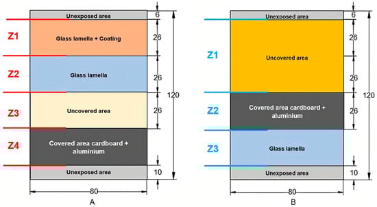 Test samples: (A). V1—Uncoated wood support, coating on glass lamella: dimensions and various specific zones/light exposure situations (Z1–Z4); (B). V2—Coated wood support: dimensions and various specific zones/light exposure situations (Z1–Z3). (reproduced from [46] with permission).