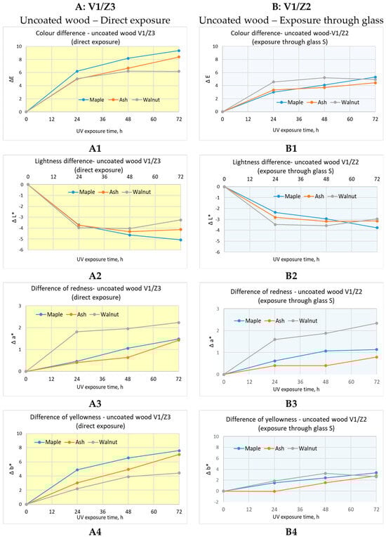 Comparative in-time evolution of light-induced colour changes (ΔE, ΔL*, Δa*, Δb*) for uncoated maple, ash and walnut wood surfaces (samples type V1) depending on the exposure situation: (A)—direct exposure to UV light (V1/Z3); (B)—exposure through a 1 mm thick clear glass lamella (V1/Z2).