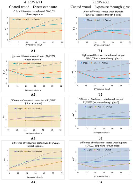 Comparative in-time evolution of light-induced colour changes (ΔE, ΔL*, Δa*, Δb*) for maple, ash and walnut wood surfaces coated with waterborne acrylic-polyurethane lacquer F1 (samples type V2), depending on the exposure situation: (A)—direct exposure to UV light (F1/V2/Z1); (B)—exposure through a 1 mm clear glass lamella (F1/V2/Z3).