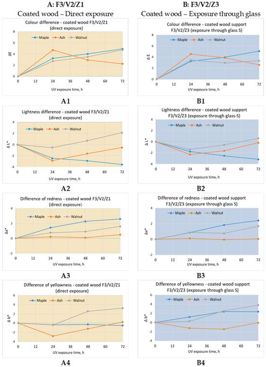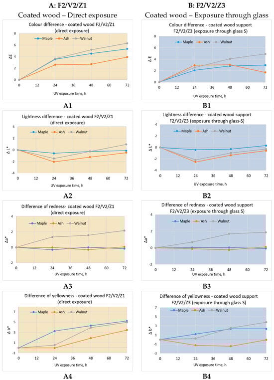 Comparative in-time evolution of the light-induced colour changes (ΔE, ΔL*, Δa*, Δb*) for maple, ash and walnut wood surfaces coated with waterborne acrylic lacquer F2 (samples type V2), depending on the exposure situation: (A)—direct exposure to UV light (F2/V2/Z1); (B)—exposure through a 1 mm clear glass lamella (F2/V2/Z3).