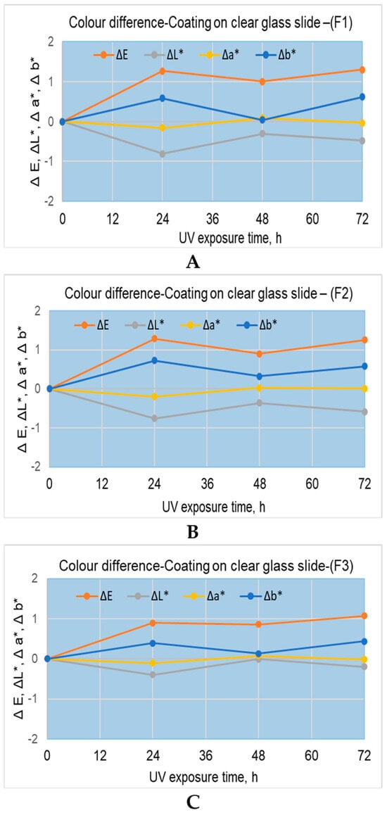 The colour changes (ΔE, ΔL*, Δa*, Δb*) in the finishing films applied on 1 mm clear glass slides as a result of light exposure for different periods of time are presented in Figure 7. It can be easily observed that for all the three types of coatings, there were registered similar wavy patterns in colour changes. These were maximal after the first 24 h of exposure and consisted mainly in slight darkening (∆L* negative) and yellowing (∆b* positive). By further light exposure, the initial trend reversed twice. Redness evolved similarly but the changes were very low, close to zero. Consequently, the total colour changes (ΔE) after 72 h light exposure for the three types of finishing films were very low: 1.30 units for F1(acrylic-polyurethane), 1.25 units for F2 (acrylic) and 1.07 units for F3 (polyurethane). However, these differences in the means for the three types of coatings were not statistically significant when analysed by one-way Anova in conjunction with Tukey’s HSD post hoc test (p values higher than 0.05 at a significance level α = 0.05).