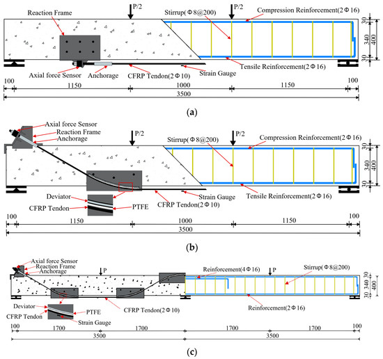 The utilization of concrete structures is of crucial significance in modern architectural and infrastructural projects. The factors related to flexural and shear performance have always been considered critical criteria that require particular focus throughout the design and construction phases. Concrete beams that are either simply supported or continuous are frequently used as structural components. These beams are subjected to cyclic loads or are exposed to corrosive conditions over time, which ultimately results in the accumulation of damage and a decline in performance [1]. Extensive research spanning decades has demonstrated that the application of external prestressing techniques not only enhances the structural flexural and shear capacity but also contributes to an improvement in rigidity [2,3,4]. Researchers have initiated the evaluation and application of fiber-reinforced polymer (FRP) tendons as a viable and environmentally friendly substitute for traditional steel reinforcement, owing to the notable progress in FRP tendon manufacturing technology [5,6,7,8]. In comparison with traditional reinforcing materials, FRP composites provide a linear elastic response without a distinct yield point. Additionally, these composites offer the advantage of flexible arrangement, possess high specific strength, exhibit exceptional resistance to corrosion, and are non-magnetic [9,10,11]. The utilization of carbon fiber-reinforced polymer (CFRP) materials has been extensively employed for the purpose of flexural and shear reinforcement in reinforced concrete beams [12,13].
