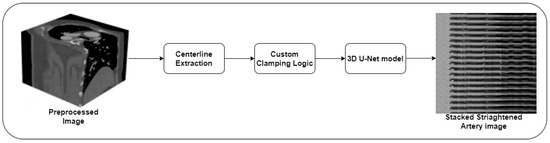 Straightening arteries reduces vascular complexity, simplifying the feature extraction process [43]. Stacking straightened images generates cohesive input for training the DL models. Straightened artery images are stacked to minimize optical angle and tortuous vessel fluctuations. Using these characteristics, the CNN models classify the images. This consistency helps the model learn and generalize across scenarios [43]. Deep learning algorithms may require fewer layers and parameters to extract useful information from straightened artery images compared to complex, convoluted representations. This may boost model performance and training efficiency. In order to extract the straightened arteries from the 3D CCTA images, the authors follow the Candemir et al. [43] model. However, they used a three-dimensional U-Net model to improve the performance of the extraction process. The annotated 3D CCTA images are processed through the U-Net model in order to extract the normal and abnormal images. The centerline extraction method is used to deform the mean shape model to the vessel volume. It utilizes the coronary ostia and cardia chambers for centerline extraction. Figure 2 shows the recommended straightened artery extraction technique.