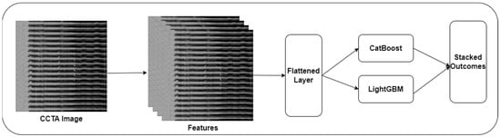 In this study, the authors built a CAD detection model using the EL technique. The EL technique is a prominent strategy integrating numerous base models to increase overall prediction performance. In contrast to straightforward ensemble methods such as bagging and boosting, stacked generalization combines the benefits of multiple base models to produce a more robust and accurate predictive model. A meta-model learns to efficiently balance the contributions of each base model, which may capture different elements of the underlying patterns in the CCTA images. Medical image classification relies on RF [38], CatBoost [39], and Microsoft’s Light Gradient Boosting Machine (LightGBM) [40] due to their robust performance, interpretability, and ability to handle complex data. LightGBM is an efficient and fast gradient boosting system [40]. A histogram-based learning strategy is employed to expedite training by dividing continuous feature values into discrete bins. As an EL technique, RF constructs multiple decision trees and integrates their findings. The generalizability and robustness of results are enhanced using the ensemble technique. Compared to other models, CatBoost typically requires limited hyperparameter modification, making it user-friendly for medical image analysis with various features. LightGBM is scalable and handles massive datasets, making it ideal for medical imaging applications with multiple images and features. Therefore, the authors were motivated to apply CatBoost, LightGBM, and RF models in the proposed study for classifying the CCTA images.