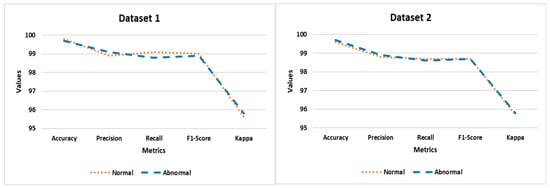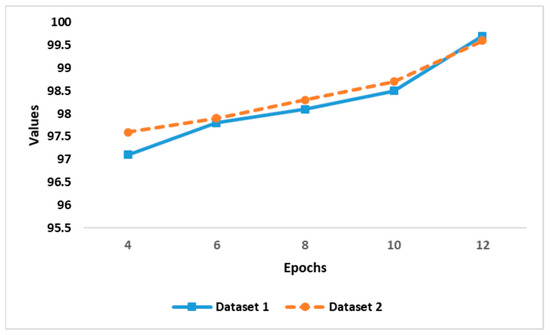 To evaluate the performance of the proposed CAD detection model, the authors used Windows 10 Professional, Intel i7 with 16 GB RAM, NVIDIA GeForce RTX 3050, and the Python 3.8.1 environment. They generalized the model using datasets 1 and 2. The datasets are divided into a train set (70%) and a test set (30%). The source codes of MobileNet V3, CatBoost, and LightGBM are extracted from the Github repositories [39,40]. However, the suggested image pre-processing and fine-tuning procedures are required to generate the outcome. In addition, PyTorch and Keras libraries are used for the model development. The authors trained the model with epochs of 12 and 16 and batches of 14 and 15 for datasets 1 and 2, respectively. A learning rate of 1 × 10−4, strides of 2, a decay rate of 0.94 per 2 epochs, and a sigmoid function are used for the image classification. Figure 5 shows the performance of the proposed model in different epochs. The proposed EL-based CAD detection achieved an exceptional outcome. The suggested feature engineering model assists the model in identifying the normal and abnormal classes effectively.
