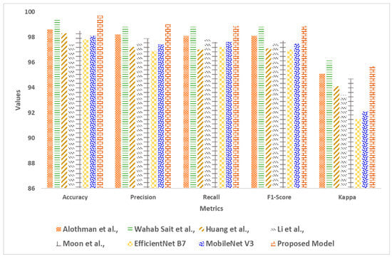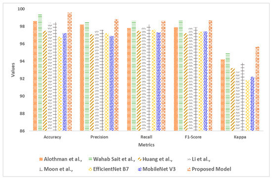 Alothman et al. [28] employed a set of image preprocessing techniques and a pretrained model for classifying the CCTA images. Likewise, Wahabsait et al. [29] employed a UNet++ model that requires additional computational resources for CAD detection. Huang et al. [35] built the CAD detection model using the one-dimensional sequence checking hybrid technique. They used the 3D-U-Net architecture for image segmentation. The model demanded substantial computational resources to produce a reasonable performance. Moon et al. [36] proposed an algorithm to extract critical elements of CAD. They applied a self-attention mechanism for classifying the images. The gradient-weighted class activation mapping was used to visualize the stenosis locations. Li et al. [37] proposed a risk stratification system for predicting CAD. They employed a fusion framework to identify CAD from the complex images. The EfficientNet B7 architecture is relatively complex, which may pose challenges to implementing the CAD detection model in a resource-constrained environment. A dedicated hyperparameter tuning was required to enhance the EfficientNet B7 model’s efficiency. The MobileNet V3 model is a lightweight feature extraction model. An additional training phase and image preprocessing were required to detect CAD effectively. In contrast, the proposed model followed the EL approach for image classification. It required a limited amount of resources to generate the outcome. Disanto et al. [46] introduced an image preprocessing technique to enhance the quality of the CCTA images. They employed multiple filter techniques to support the DL models in detecting CAD. The proposed CAD detection model has used Frangi and Sato filters to overcome the challenges in classifying the CCTA images. The findings revealed that the suggested image preprocessing techniques have improved the proposed model’s performance.
