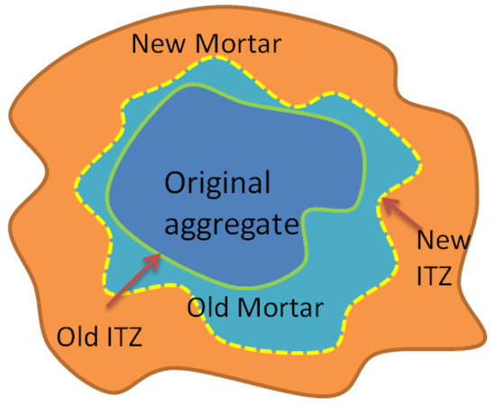 In this experiment, the concrete proportion design was carried out according to the JCJ55-2011 “Design Procedures for Ordinary Concrete Proportions”, and 30% of recycled coarse aggregate was substituted for natural coarse aggregate. The unmodified recycled coarse aggregate was made into recycled concrete according to the standard as the reference group (RAC), and the recycled concrete was made by immersing the recycled coarse aggregate in 5% water glass for 1 h and 8% silane solution for 24 h, and 5% water glass solution for 1 h + 8% silane solution for 24 h were used as the control group (WRAC, GRAC, WGRAC). The materials in the recycled concrete are shown in Table 5, and a schematic diagram of the recycled concrete interface is shown in Figure 1.