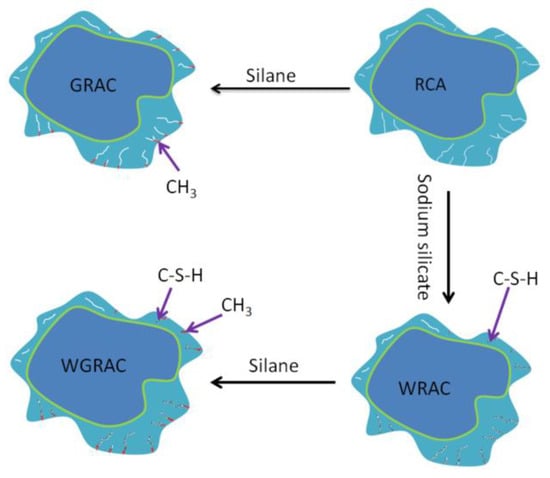 The use of recycled coarse aggregates enables the reuse of resources and reduces the extraction of natural stone; it also reduces the ecological damage caused by construction waste. However, when recycled coarse aggregates are crushed and processed again, the microcracks inside the aggregates increase a lot, and part of the old mortar is attached to the surface, resulting in high water absorption of the recycled concrete [3,4,5]. Thus, it is necessary to strengthen recycled coarse aggregates. Currently, the more frequently used and effective strengthening method is the chemical modification method; the chemical modification method is involves the recycled coarse aggregate being soaked in a chemical solution to improve the performance of the recycled coarse aggregate through the product of a chemical reaction [6]. C. Christodoulou et al. [7] measured the capillary water absorption of bridges treated with silane for 20 years and found that the bridges were still well waterproofed and protected. M. Medeiros and P. Helene et al. [8] found that the water absorption of concrete surfaces treated with silane hydrophobizing agents was reduced by 2.12 times. Ya-GuangZhu et al. [9] experimented by either applying silane on the surface of concrete or by adding it to the concrete as a whole, and it was found that both treatments improved the resistance of recycled concrete to capillary water absorption, carbonation, and chloride ion penetration. Mazen J. Al-Kheetan et al. [10] showed a 7% decrease in the water absorption of concrete after treating glass powder with silane. DujianZou et al. [11] found that both the surface silane modification of recycled aggregate and cementitious monolithic silane modification can improve the freeze–thaw durability of recycled aggregate pervious concrete. QingWang et al. [12] found that the addition of an appropriate amount of water glass to recycled aggregate concrete can improve its strength. Sang-SoonPark et al. [13] impregnated concrete with water glass and found that the strength of the concrete was slightly increased, but the porosity of the concrete was improved more significantly, and its resistance to chloride ions was significantly increased. Bin Zhang et al. [14] showed that the microcracking of concrete with the addition of sodium silicate material was less than that of conventional materials. Saud Al-Otaibi et al. [15] used 4% and 6% water glass as activators to be added to the concrete, and the durability of the concrete was better in both cases. Baifu Luo et al. [16] found that soaking the recycled coarse aggregate in the prepared water glass solution reduced the water absorption of the recycled coarse aggregate. Hongru Zhang et al. [17] treated the surface of recycled coarse aggregate with a 3% solution of water glass, which resulted in decreases in the water absorption and crushing value of 23.36% and 16.59%, respectively. D. A. Kagi et al. [18] found a more pronounced decrease in the water absorption of concrete by immersing the concrete in a diluted water glass solution and then in a diluted alkyl quaternary ammonium salt solution. The silane and water glass production process has become more mature, with less pollution to the environment, good adhesion with concrete, corrosion resistance, high-temperature resistance to weathering, and low production costs. Additionally, when dealt with appropriately, it can be transformed into a harmless substance used for recycled aggregate reinforcement, reducing the mining of natural aggregates and protecting the environment.