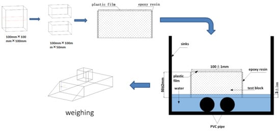 When the set number of freezing and thawing cycles of the specimen was reached, they were removed with a cutting machine along the center axis, cut into 100 mm × 100 mm × 50 mm small specimens, and placed in the oven at 105 (±5) °C and baked for 48 h. The specimens were cooled to room temperature, and a surface for the absorbent was selected; the opposite sides of the absorbing surface were sealed with plastic film, while the remaining four sides were sealed with epoxy resin, evenly coated to ensure that the specimen absorbed water in one dimension during the experiment. The treated specimens were placed in an oven at a temperature of 23 (±2) °C, and the mass of the specimens was weighed after the epoxy resin was completely dried; the accuracy of the measured mass was 0.01 g. The test specimens were then sealed with a plastic film. The specimen was placed in the water-absorbing device, and the liquid surface was kept higher than the bottom surface of the specimen by 1–3 mm until the specimen reached the specified water-absorbing time. It was then removed quickly, and a rag was used to dry its surface water. The specimen was placed in the water-absorbing device, and after weighing its mass, it was quickly put into the suction device to carry out the next stage of the water-absorption test. Its different stages of capillary water absorption mass, the measurement time, and allowable error were then calculated, as shown in Table 6; the capillary water absorption process device diagram is shown in Figure 4.