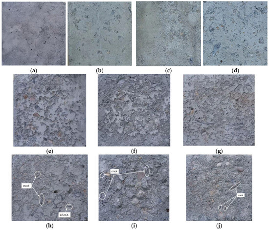 Changes in apparent morphology of the RAC group under different freeze–thaw environments. (a) Not frozen and thawed; (b) water (50 times); (c) chlorine salt solution (50 times); (d) sulfate solution (50 times); (e) water (150 times); (f) chlorine salt solution (150 times); (g) sulfate solution (150 times); (h) water (250 times); (i) chlorine salt solution (250 times); (j) sulfate solution (250 times).