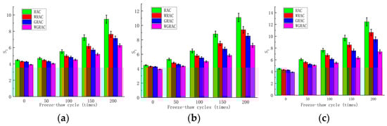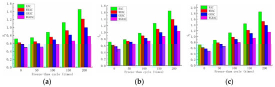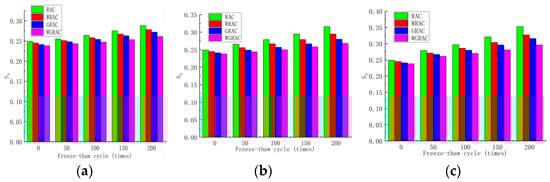 As can be seen in Figure 6a, at 50 freeze–thaw cycles, the water absorption of the WRAC, GRAC, and WGRAC groups decreased by 4.82%, 8.1%, and 13.8% compared to the RAC group. At 200 freeze–thaw cycles, the water absorption of the WRAC, GRAC, and WGRAC groups decreased by 19.4%, 24.6%, and 33.8% compared to the RAC group. As can be seen in Figure 6b, at 50 freeze–thaw cycles, the capillary water absorption of the WRAC, GRAC, and WGRAC groups decreased by 9.3%, 13.2%, and 18.1%, which are lower than that of the RAC group. At 200 freeze–thaw cycles, the pre-absorption rates of the WRAC, GRAC, and WGRAC groups decreased by 15.38%, 23.14%, and 34.83%, respectively, compared with the RAC group. As can be seen in Figure 6c, at 50 freeze–thaw cycles, the water absorption of the WRAC, GRAC, and WGRAC groups decreased by 8.1%, 13.3%, and 16.3% compared with that of the RAC group, and when 200 freeze–thaw cycles were performed, the water absorption of the WRAC, GRAC, and WGRAC groups decreased by 14.4%, 23.8%, and 38.6% compared with that of the RAC group, respectively.