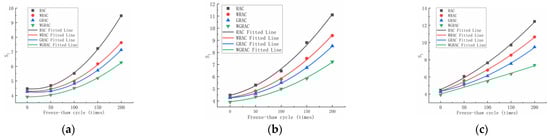From the linear fit of the mid-term phase (T1/2 = 84.8–207.8 s) of the unit’s cumulative water uptake curve, the secondary water uptake rates of the RAC, WRAC, GRAC, and WGRAC groups can be obtained, and their relationships with the number of freeze–thaw cycles in different media are shown in Figure 7.