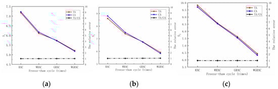 The pre-capillary water absorption of 150 freeze–thaw cycles was substituted into the above model, and the calculated and measured values of the prediction model of the pre-capillary water absorption of recycled concrete at 150 freeze–thaw cycles were obtained to verify the accuracy of the above pre-capillary water absorption model. As shown in Figure 10, the difference between the measured and calculated values of capillary water absorption in freeze–thaw specimens in different media is small, and the mean values of the ratio between the measured and calculated values are 1.002196, 1.004881, and 0.989241, respectively, with standard deviations of 0.014466, 0.004166, and 0.006897, indicating that the calculated and measured values of the model have small errors and high fitting accuracy. Thus, they can be used as an experimental control for the capillary water absorption of modified recycled concrete under freezing and thawing cycles in different media.