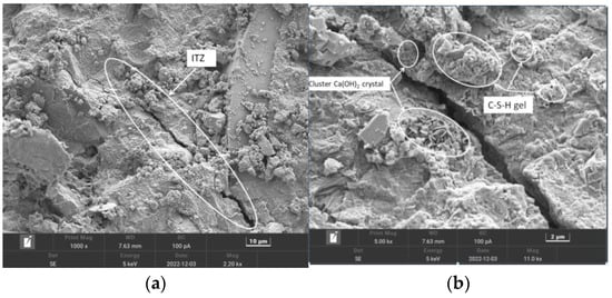 Figure 12 shows the microscopic morphology of the interior of the specimen at 250 freezing and thawing cycles in clear water, and it can be seen from Figure 12a that the cracks in the interfacial transition zone have expanded, and some new small holes and cracks have appeared on the surface. As can be seen in Figure 12b, the microcracks and holes increased significantly, the cracks were rougher and uneven, the gaps between the C-S-H gels became larger as well, the Ca(OH)2 crystals were arranged haphazardly, and the densities in the interfacial transition zone decreased. The reason for these phenomena is that water molecules penetrate the concrete interior through the pores and cracks, and through the freezing and expansion effect, the pores and cracks inside the concrete continue to expand, and new pores and cracks are generated, which leads to the loosening of the internal structure and causes damage.