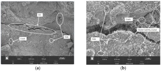Figure 13 shows the internal microscopic morphology of the specimen after 250 cycles of freeze–thaw cycles with chloride salts. As seen in Figure 13a, the surface appears to be more uneven, and the cracks and pores in the transition zone of the interface are extended significantly and increased in number. Figure 13b shows that the damage of the cracks in the interface transition zone is very serious, and the gaps between the needle-like calcite are larger, with almost no tight connection, and the arrangement is more chaotic and disorganized; additionally, it can be found that there is a lot of crystalline material near the interface transition zone, which indicates that the concrete specimen in the chlorine salt solution in the freeze–thaw cycle can not only withstand freezing and expansion, but it can also withstand the crystallization pressure due to the difference in concentration. Together, these two factors accelerated the destruction of the concrete.