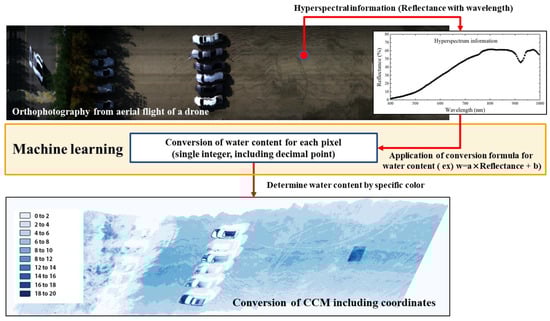 The main conceptual diagram of this study is shown in Figure 1. First, a hyperspectral camera is attached to the drone and an aerial flight is performed. At this time, the hyperspectral camera can simultaneously measure not only the overall orthophoto but also hyperspectral information (reflectance with wavelength) for each pixel. Afterward, hyperspectral information is substituted into the conversion equation for water content, developed through machine learning, and the water content for each pixel is calculated. This converts the graph of reflectance with wavelength measured in 4 nm increments in the wavelength range of 400–1000 nm into one number (water content). Therefore, each pixel in an orthophoto has latitude, longitude, and water content as a separate data value. Lastly, colors for each water content are additionally specified to visualize the CCM. At this time, color designation could be set in various ways depending on the user.