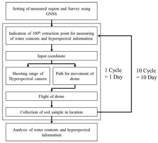 The goal of this study is to convert hyperspectral information, acquired at road construction sites where compaction processes are performed, into water content. To achieve this, actual water content and hyperspectral information at the same location are required, and a database for this must be secured. With a large amount of data, unnecessary data can be deleted and the accuracy of the predicted equation of water content using hyperspectral information can be improved. The data acquisition process was carried out as shown in Figure 2. At this time, 100 pieces of actual water content and hyperspectral information were acquired per drone flight. Drone flights were conducted a total of 10 times at intervals of 2 to 3 days, considering the influence of weather, among other things.