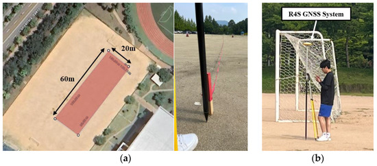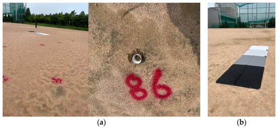 This ground is granular soil, a type of sand with an optimal water content of 9 to 12%. This material is mainly soil brought in during the process of creating a subgrade at a road construction site. It has no cohesion, and the water content varies depending on the weather (including temperature). First, the area from which the actual water content and hyperspectral information would be extracted was determined. As shown in Figure 3a, the shooting area was set to approximately 20 m in width and 60 m in length, considering the area of the playground. In addition, stakes were driven in to ensure that the area was captured in the orthophotos taken by the drones, and a rectangular area was marked by connecting each corner with a red string. At this time, four coordinates of each corner of the rectangular range were extracted through GNSS surveying. The equipment used was the R4S GNSS System (Trimble, Westminster, CO, USA), and the political surveying accuracy was measured within 3.5 mm. The measurement range and GNSS survey are as shown in Figure 3b.