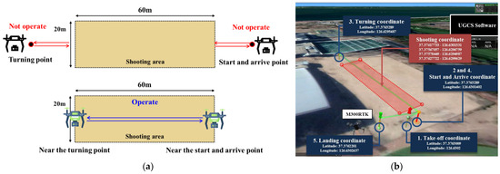 The actual width of the shooting area is 20 m, but considering coordinate errors, among other things, the shooting width was set to 30 m. The shooting width is affected by the altitude of the drone, and considering the overlap of 1.6, the shooting altitude is 60 m and the speed is 5.49 m/sec, shown in Table 2. Accordingly, the time-of-flight path based on a length of 60 m is 22 s, and when landing, takeoff, departure, turning, and arrival points are comprehensively considered, the experiment time for one cycle (Figure 2) is about 1 min.
