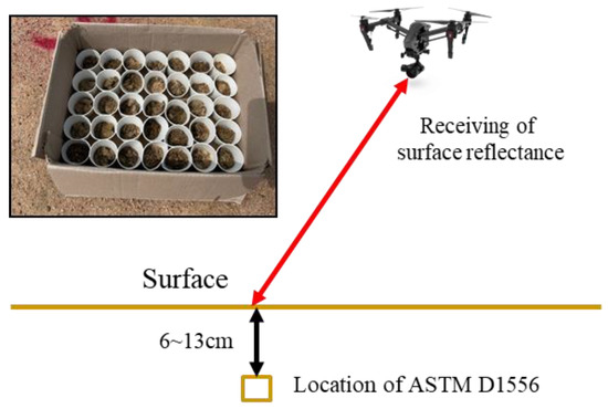 At road construction sites, the filling height of the subgrade soil is generally 20 cm. In tests for the quality control of compaction [33], about 6 to 13 cm of soil is sampled, and water content is measured at this time. However, the hyperspectral information to be converted to water content is measured from a drone and can also be called the surface water content, because the camera measures only the reflectance of the ground surface. Therefore, it is necessary to confirm whether the hyperspectral information can reflect the inside water content such as Figure 7. Soil was sampled from the surface and 6 cm or less below the upper part, underneath the number indicated by spray lacquer, and the relationship between the surface and inside water content was confirmed. The amount of soil sampled was at least 50 g. At this time, the water content of the sample was measured after obtaining hyperspectral information from the drone flight.
