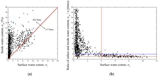 The ratio (ws/win) of the surface and the inside water content is shown in Figure 8b. The closer the ws/win is to 1, the closer the surface and inside water content values are same. Overall, the ws/win was within the range of 0.29–58.4, and when targeting a surface water content of 4% or more, it was within the range of 0.56–2.0, except for seven points. In other words, it can be said that the surface water content of 4% or more represents the inside water content. There are 164 data with a surface moisture content of 4% or more, with an average of 1.18 times, standard deviation of 0.322, and coefficient of variation of 27%. This is relatively good compared to the average of 0.346 times, standard deviation of 0.346, and coefficient of variation of 100% of all data (including data below 4%).