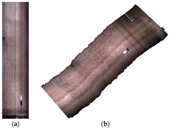 Geometric correction is intended to correct errors (geometric distortion) that occur in the process of representing the 3D Earth on a 2D plane. This is the task of converting hyperspectral data so it is located in an appropriate actual location, corresponding to pixel coordinates of satellite images and geographical coordinates on the ground. As shown in Figure 9a, the image captured from the drone shooting path is converted to include coordinates, as shown in Figure 9b.