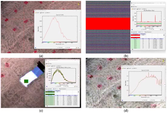 The four-point coordinates previously acquired through GNSS surveying were input to the hyperspectral camera. Here, the hyperspectral camera was the Shark microHSI 410 (Corning, Corning, NY, USA), which is capable of measuring reflectance in units of at least 4 nm in the wavelength range of 400 to 1000 nm. The bands related to water absorption are generally known as the SWIR (Short Wavelength InfraRed, wavelength of 900–2500 nm) region, such as 930, 1450, 1950, and 2500 nm. However, according to Tian and Philpot [24], in the case of materials made of irregular soil particles such as sand, there is no significant difference in the SWIR region when water is present, and the difference in reflectance with water content is clearly visible in the VNIR (Visible and Near-InfraRed) region of 400–1000 nm. Therefore, in this study, a hyperspectral camera in the VNIR region was used.