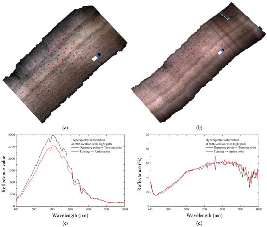 Figure 11a is an orthophoto when moving from the departure coordinates to the turning coordinates, and Figure 11b is an orthophoto when moving from the turning coordinates to the arrival coordinates. At this time, the input coordinates were the same, but there was a difference in the actual photographed range. This is a coordinate error that occurs during the drone flight process and caused by the push-broom method. This phenomenon can also occur in reverse and is difficult to predict. Therefore, when flying a drone, the measured area must be checked at least twice, and an orthophoto that is clearer or has a larger shooting area should be selected. Figure 11c is the hyperspectral information extracted from the 60th location of each orthophoto before correction, and Figure 11d is the hyperspectral information after correction. The reflectance before correction differed by 400–800 nm, but the reflectance after correction had very similar values. Accordingly, it was confirmed that atmospheric correction was appropriately reflected.