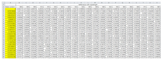 The final database was composed of an Excel sheet, as shown in Figure 12. Column A is the surface water content, column B is the reflectance extracted at a wavelength of 400 nm, and columns C to EU are the reflectance extracted in 4 nm increments at a wavelength of 404–1000 nm.