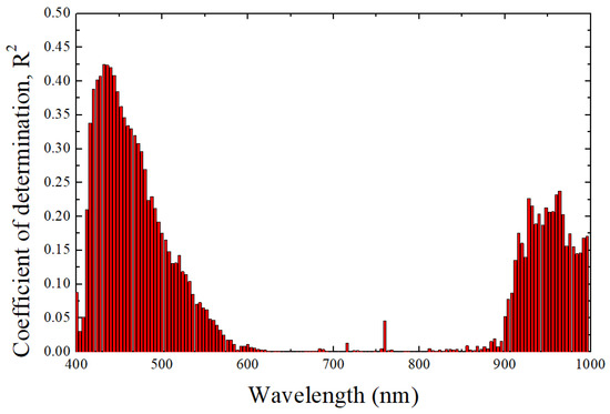 Figure 13 shows R2 with each wavelength from the results of simple linear regression. The R2 has low values, below 0.5 in most cases, and when using wavelengths of 600–900 nm, the R2 tended to converge to 0. Accordingly, it was confirmed that it was difficult to calculate the predicted equation of water content through simple linear regression using reflectance for each single wavelength.