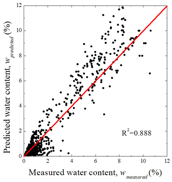 The correlation between the measured and predicted water content derived through machine learning is shown in Figure 14. The R2 was 0.888, which was confirmed to be very high compared to the results of simple linear regression.
