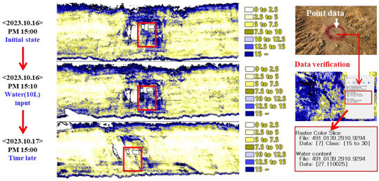 Figure 16 is a CCM created for the purpose of checking the change in water content over time. Here, the data were obtained from an actual road construction site, not the existing experimental site. When the water content was artificially increased based on the initial state, the CCM changed, and it was confirmed that the water content was drying after one day with the red frames in the center. Additionally, the data can be used to check water content for quality control. After indicating the location, the water content of a specific point can be obtained relatively easily through CCM generation.