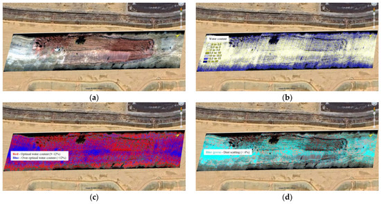 Utilization of CCM through Google Earth: (a) Normal orthophoto; (b) Water content separated into 2.5% units; (c) Classification based on optimal water content; (d) Area of dust scattering.