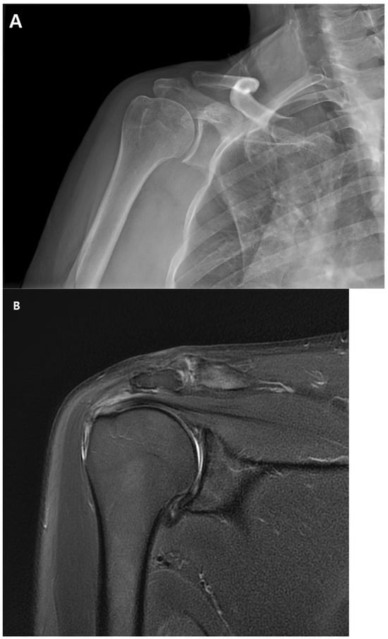 (A). Preoperative plain anteroposterior radiograph. Acromioclavicular joint alignment was acceptable with no arthritic changes. The glenohumeral joint showed adequate joint space and congruency. (B). Oblique coronal T2 fat-suppressed magnetic resonance imaging (MRI). MRI of the right shoulder showed a thickened axillary pouch with normal hypointense joint capsule. The supraspinatus tendon had high signal variation with intact continuity.