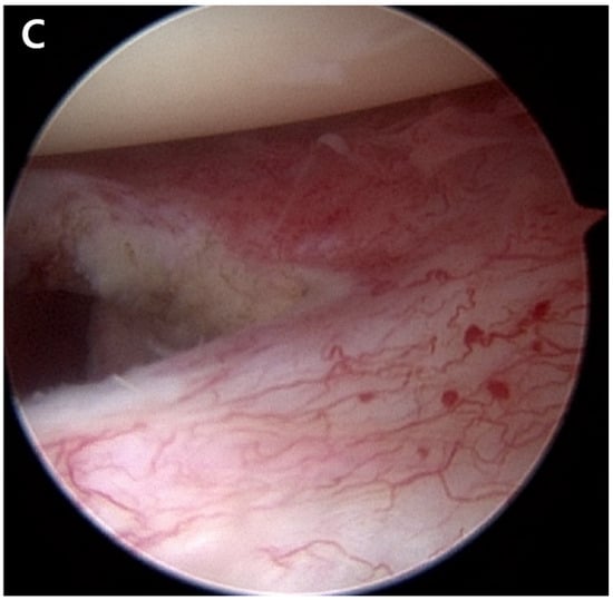 Arthroscopic capsular release was performed. (A). Release of the thickened middle glenohumeral ligament was performed. (B). The inferior capsule was released using a radiofrequency ablation device. (C). Engorgement synovitis and capsule thickening were observed.