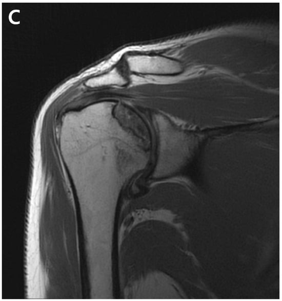 (A). Postoperative plain radiograph obtained 21 months post-ACR. (B). Oblique coronal T1 fat-suppressed MRI. (C). Oblique coronal T2 fat-suppressed MRI shows osteolytic changes in the superomedial humeral head. MRI shows cystic changes in the epiphyseal area, but articular congruity remains preserved.