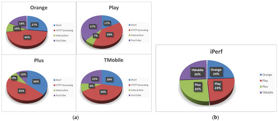 (a) Percentage of analyzed service bins for each MNO and (b) percentage of MNO bins in iPerf test.