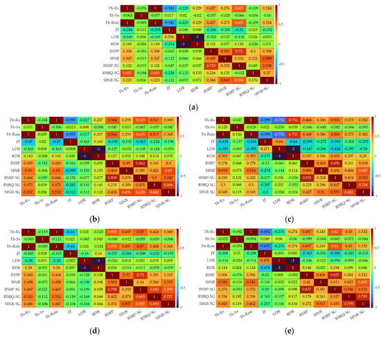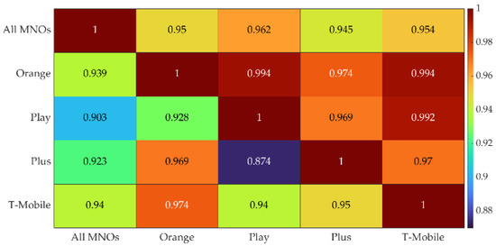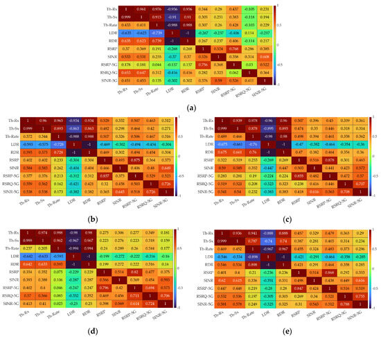 Our analysis is based on the Pearson Correlation Coefficient (PCC) [7] between a pair of two variables represented by analyzed parameters. The description of PCC and interpretation of its values [54] is shown in Appendix B. Based on Equation (A1), we determined the correlation degree for every pair of two measured metrics defined in Section 2.4. The PCC results for TCP are presented in Figure 4. This figure depicts one heatmap averaged for all MNOs (a); and four heatmaps for each MNO, i.e., (b) Orange, (c) Play, (d) Plus, and (e) T-Mobile, respectively. Each heatmap shows PCCs for UL and DL illustrated in upper-right and lower-left edges, respectively.